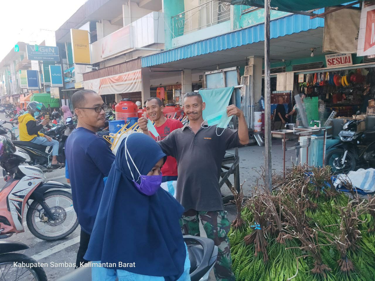 Berangkat dari hal tersebut Serma Hendro anggota Zidam XII/Tanjungpura yang melaksanakan tugas pengawasan pembangunan guna kebutuhan TNI AD yang berada diwilayah Kalbar mendapat misi untuk sosialisasi tentang cara penyebaran Covid -19 dan pentingnya menggunakan masker kepada masyarakat di Pasar Sambas.